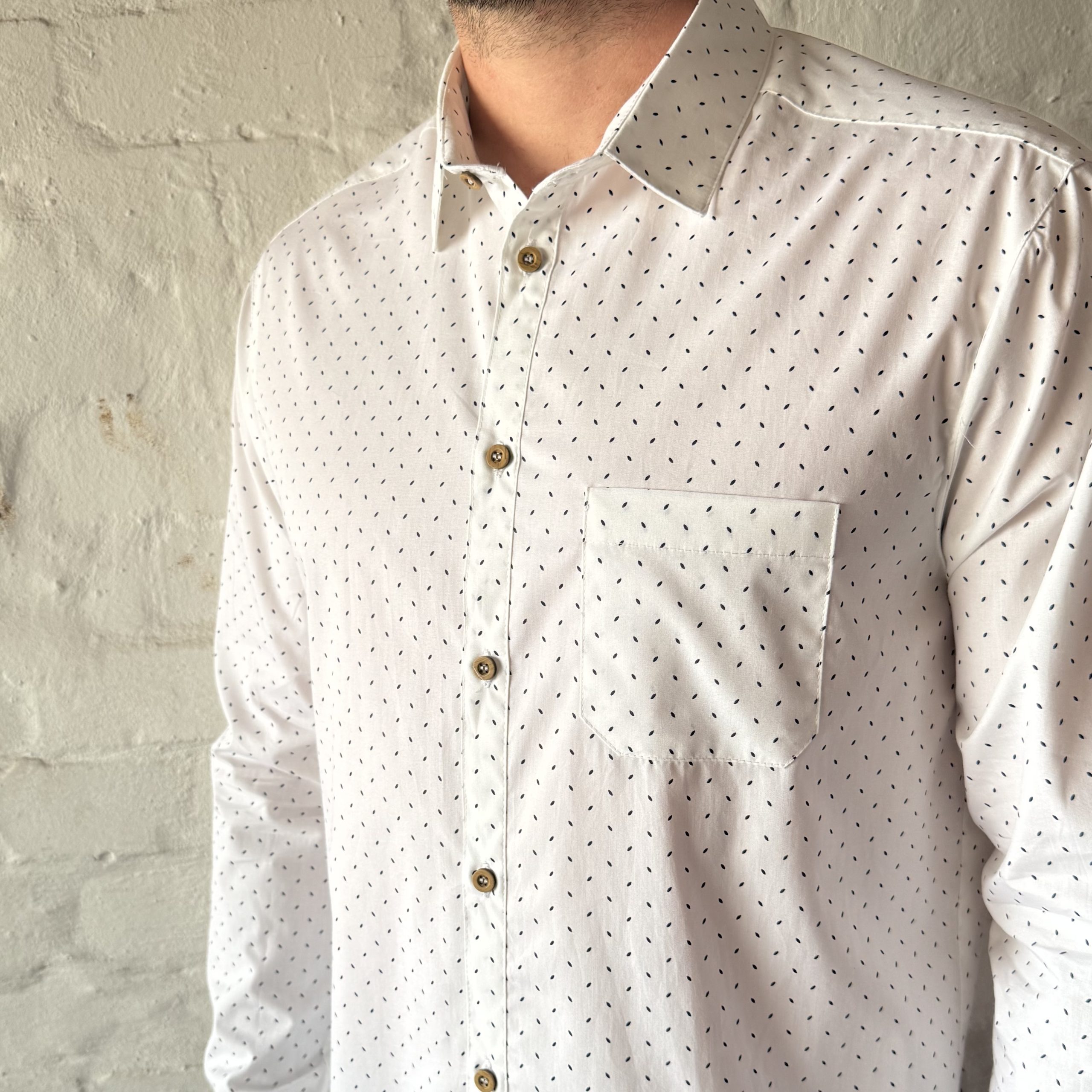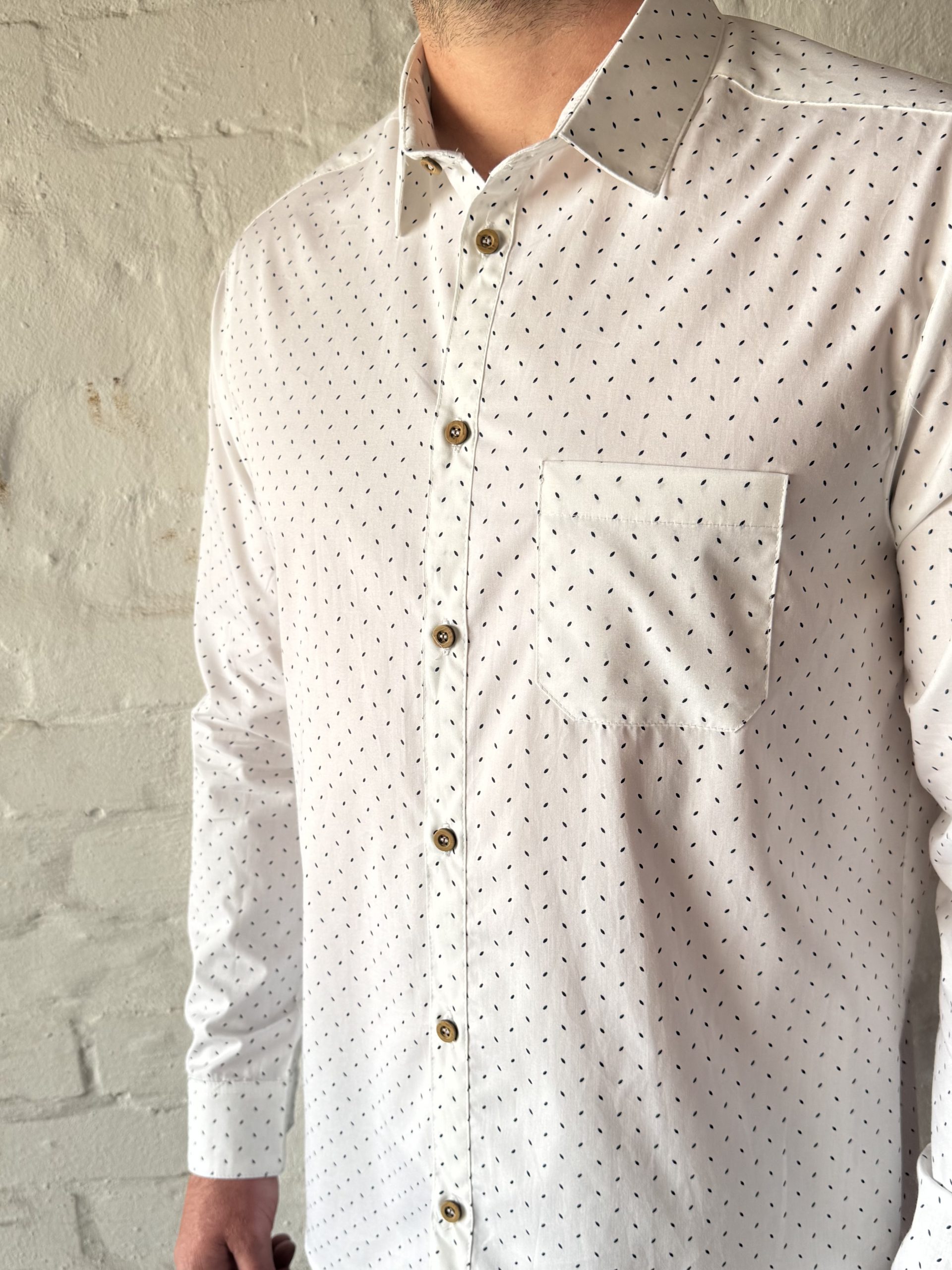 Long sleeve Printed Cotton slim fit shirt with centre back seam and wood look buttons.