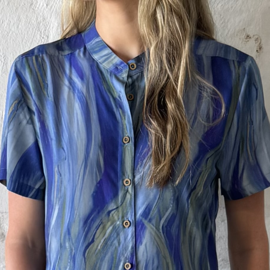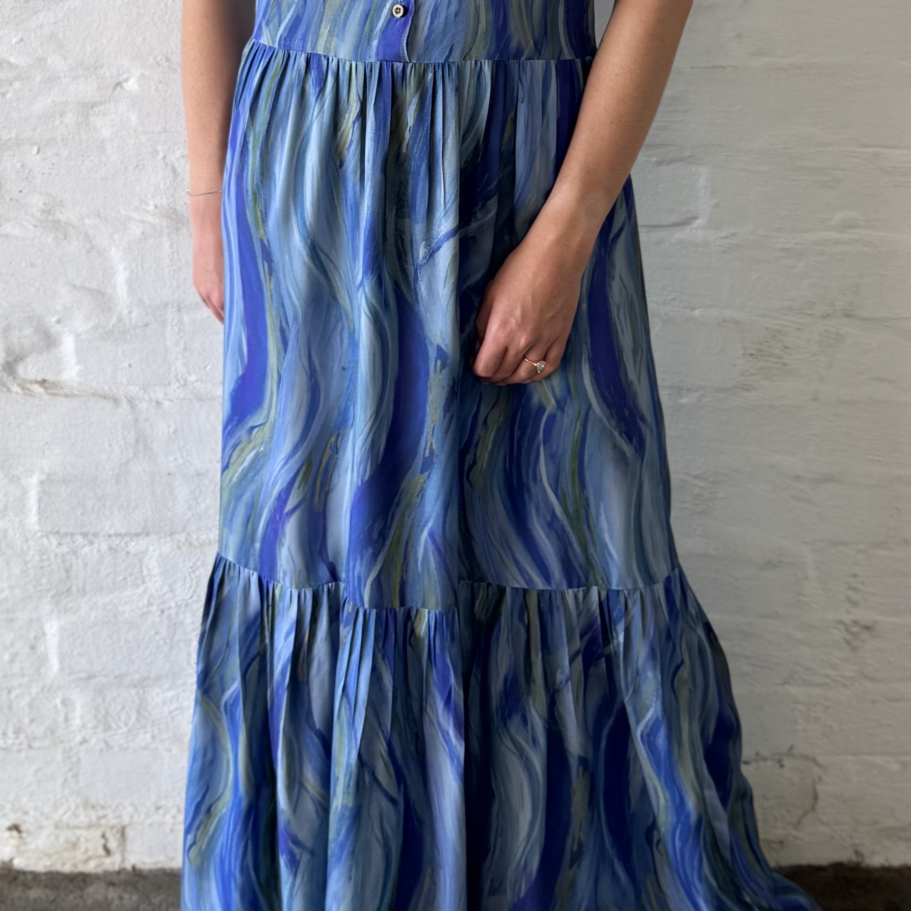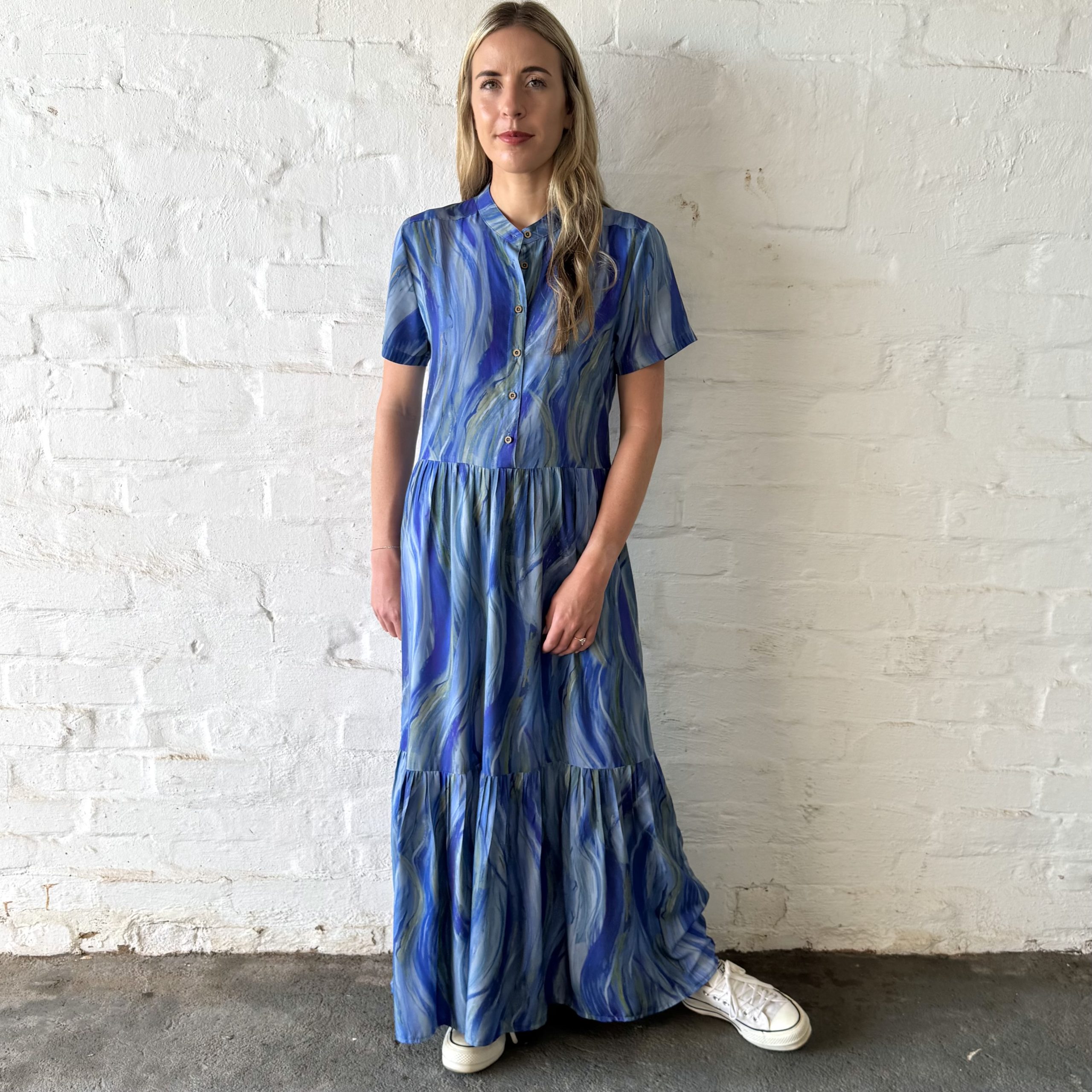 Tiered Maxi Dress with high waist, mandarin collar and short sleeve in digital print viscose (Exclusive to HIS Apparel)