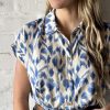 Rayon poplin button up top with shirt collar and Cap sleeve