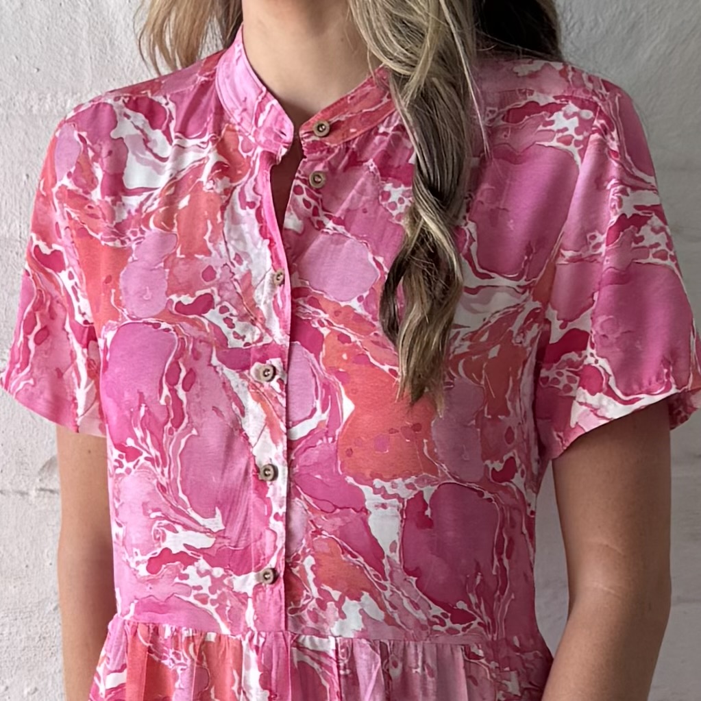 Tiered Maxi Dress with high waist, mandarin collar and short sleeve in digital print viscose (Exclusive to HIS Apparel)